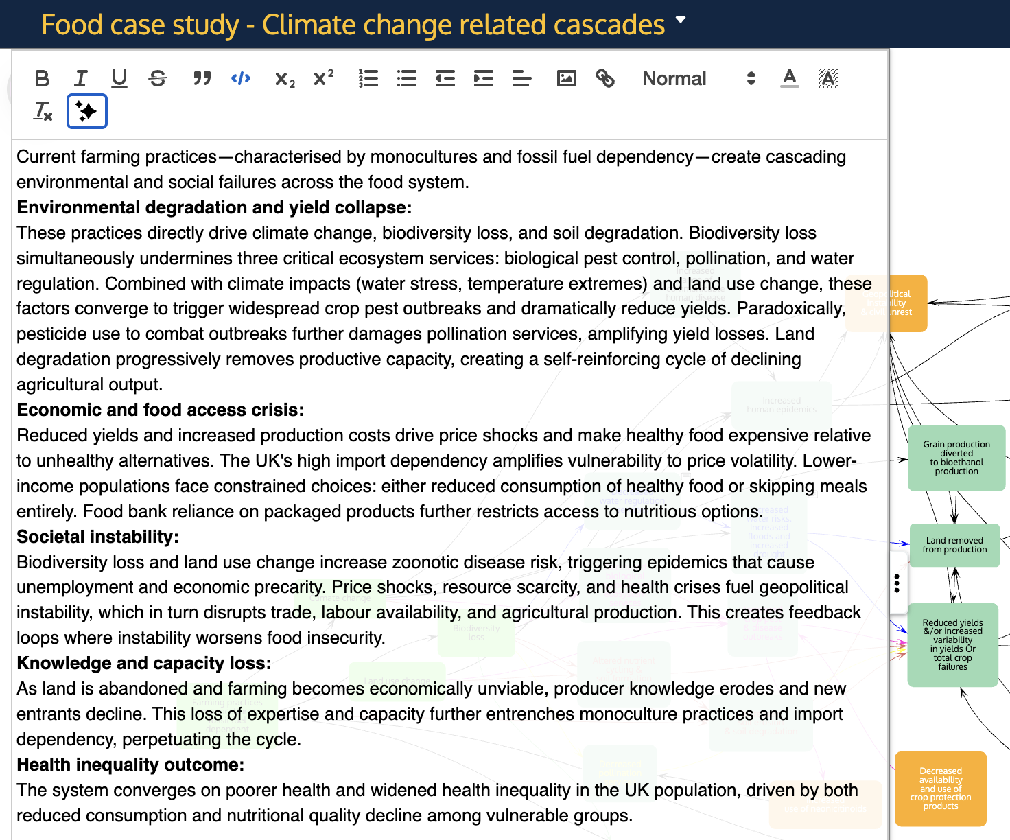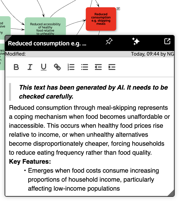 When you open the map overview (using the toggle at the middle left edge of the map window), the editing toolbar at the top includes the 'Sparkle' button that can be used to get an AI generated description of the whole map. The AI is provided with the map (the factor labels and the links) and the map title to base its description on. The same cautions should be borne in mind: the text it generates should be treated as fallible and only a starting point for a more expert and more informed description. Do not rely on the accuracy of the text, or on the validity of the web links and academic papers cited. It should be carefully checked.